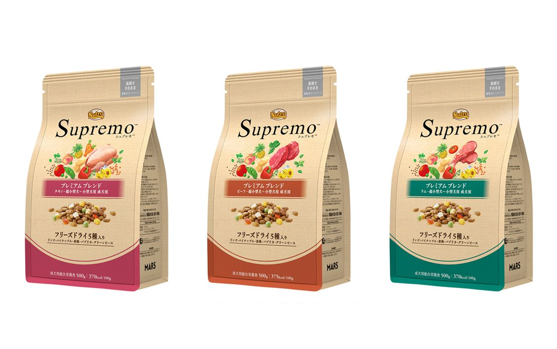 マース ジャパン リミテッド(本社:東京都港区、社長:後藤 真一)は、厳選自然素材のホリスティック・ブレンドで設計されたひとつ上を行くナチュラルフード*1を提供するドッグフードブランド「ニュートロ™ シュプレモ™」より、新たなラインアップとして、5種類の果物・野菜のフリーズドライとキブル(粒)をブレンドすることでさらに自然素材のおいしさを追求したプレミアムな新ブランド「ニュートロ™ シュプレモ™ プレミアム ブレンド」シリーズを8月29日より出荷開始し順次、全国のペット専門店で発売します。